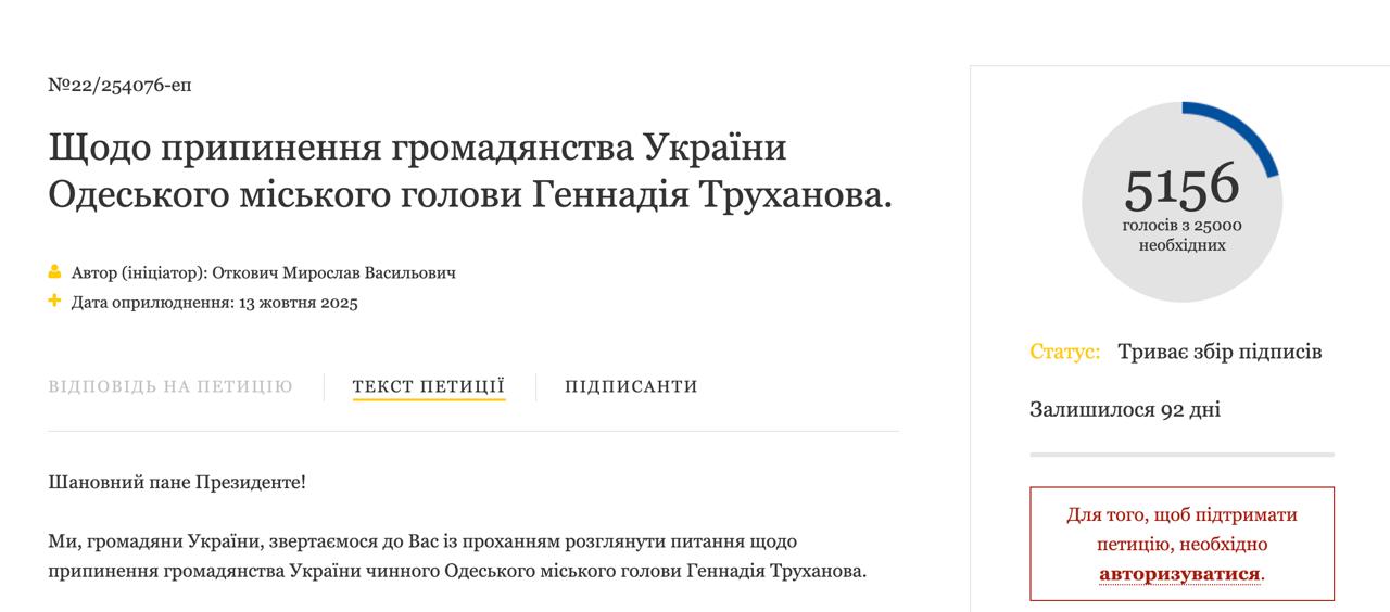 После того, как СМИ сообщили о подготовке на Банковой указа о лишении украинского гражданства мэра Одессы Геннадия Труханова, на сайте Офиса президента появилась петиция с аналогичным предложением.