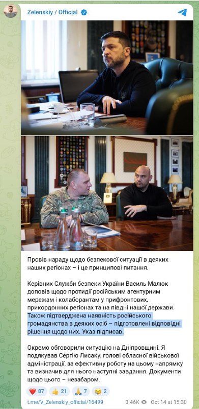 Руководитель Службы безопасности Украины Василий Малюк доложил о противодействии российским агентурным сетям и коллаборантам в прифронтовых регионах и на юге нашего государства. Также подтверждено наличие российского гражданства у некоторых лиц – подготовлены соответствующие решения по ним. Указ подписал", - сказано в публикации.