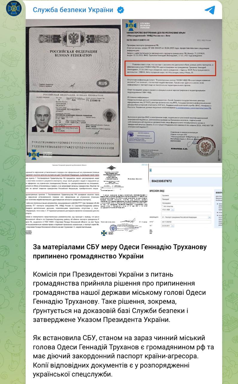 Владимир Зеленский сообщил, что подписал указ о лишении украинского гражданства отдельных лиц. Судя по контексту сообщения и упоминания в нем южного региона страны и наличия гражданства РФ у отдельных лиц, он имеет в виду мэра Одессы Геннадия Труханова.