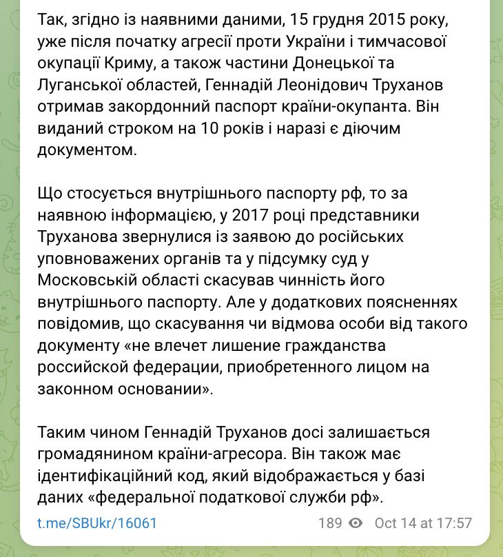 В свою очередь СБУ официально сообщила, что Труханова лишили гражданства на основании ее материалов.