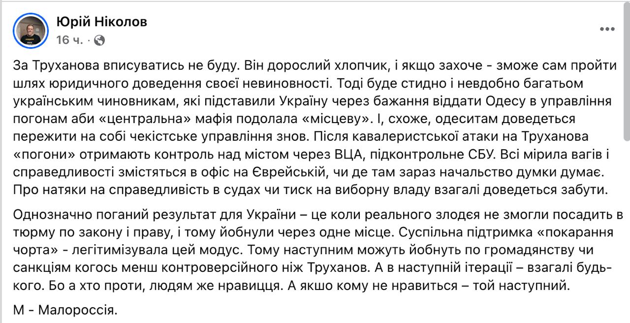 "Украинские чиновники подставили Украину из-за желания отдать Одессу в управление погонам, чтобы центральная мафия победила местную. И похоже, одесситам придется снова пережить чекистское управление. После кавалерийской атаки на Труханова погоны получат контроль над городом через ВГА, подконтрольную СБУ (Лысак - выходец из СБУ - Ред.). О намеках на справедливость в судах или давлении на выборную власть вообще придется забыть. Однозначно плохой результат для Украины – это когда реального злодея не смогли посадить в тюрьму по закону и праву, и поэтому е@нули через одно место. Общественная поддержка наказания черта легитимизировала этот модус. Поэтому дальше могут е@нуть по гражданству или санкциям кого-то менее контроверсионного, чем Труханов. А в следующей итерации – вообще кого угодно. Потому что кто против, людям же нравится. А если кому не нравится – тот следующий. М - Малороссия", - написал Николов.