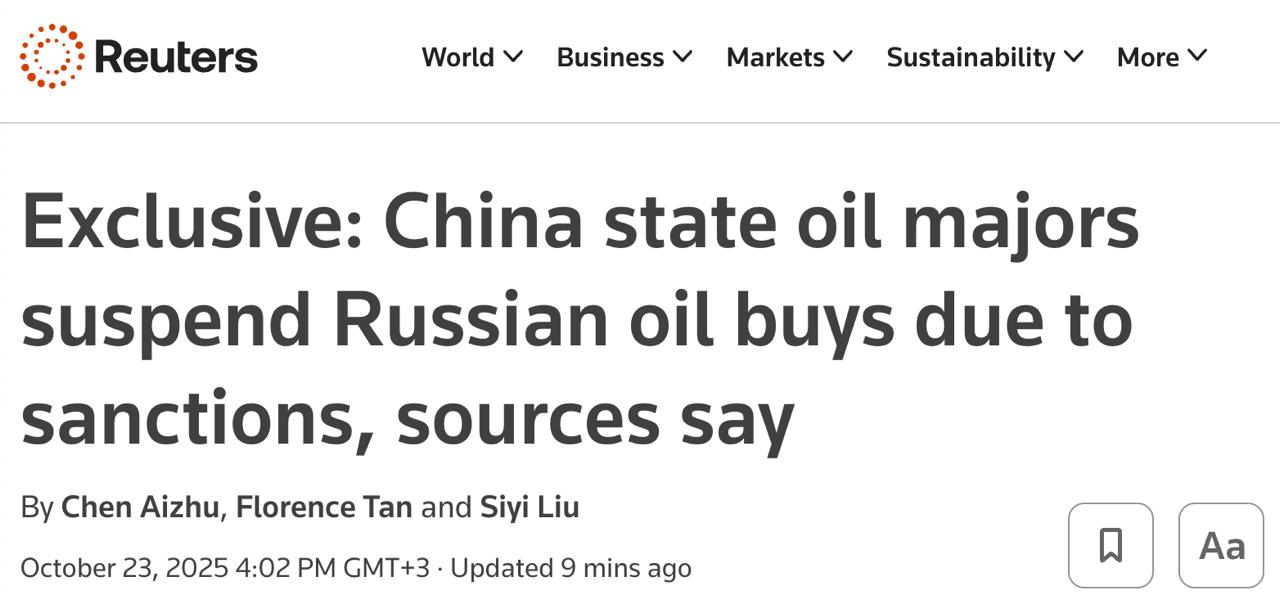 Между тем агентство Reuters со ссылкой на источники написало, что китайские государственные нефтяные компании приостановили закупки российской нефти из-за новых американских санкций. Как сказано в материале, ожидается, что частные заводы по переработке нефтепродуктов тоже приостановят закупки, чтобы оценить влияние санкций, но в итоге попытаются их обойти и восстановить закупки.