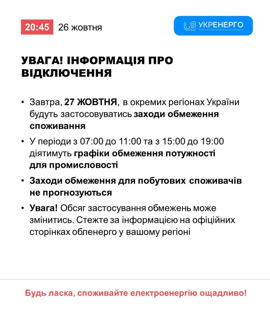 22:22 Завтра в Украине отключать свет у бытовых потребителей не будут, сообщает "Укрэнерго".
