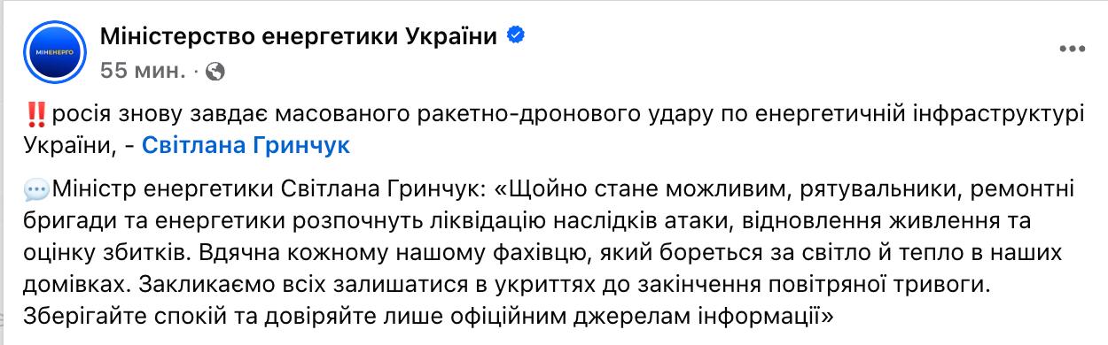 7.41 Минэнерго заявило об ударах по энергетике, которые идут в этот момент.