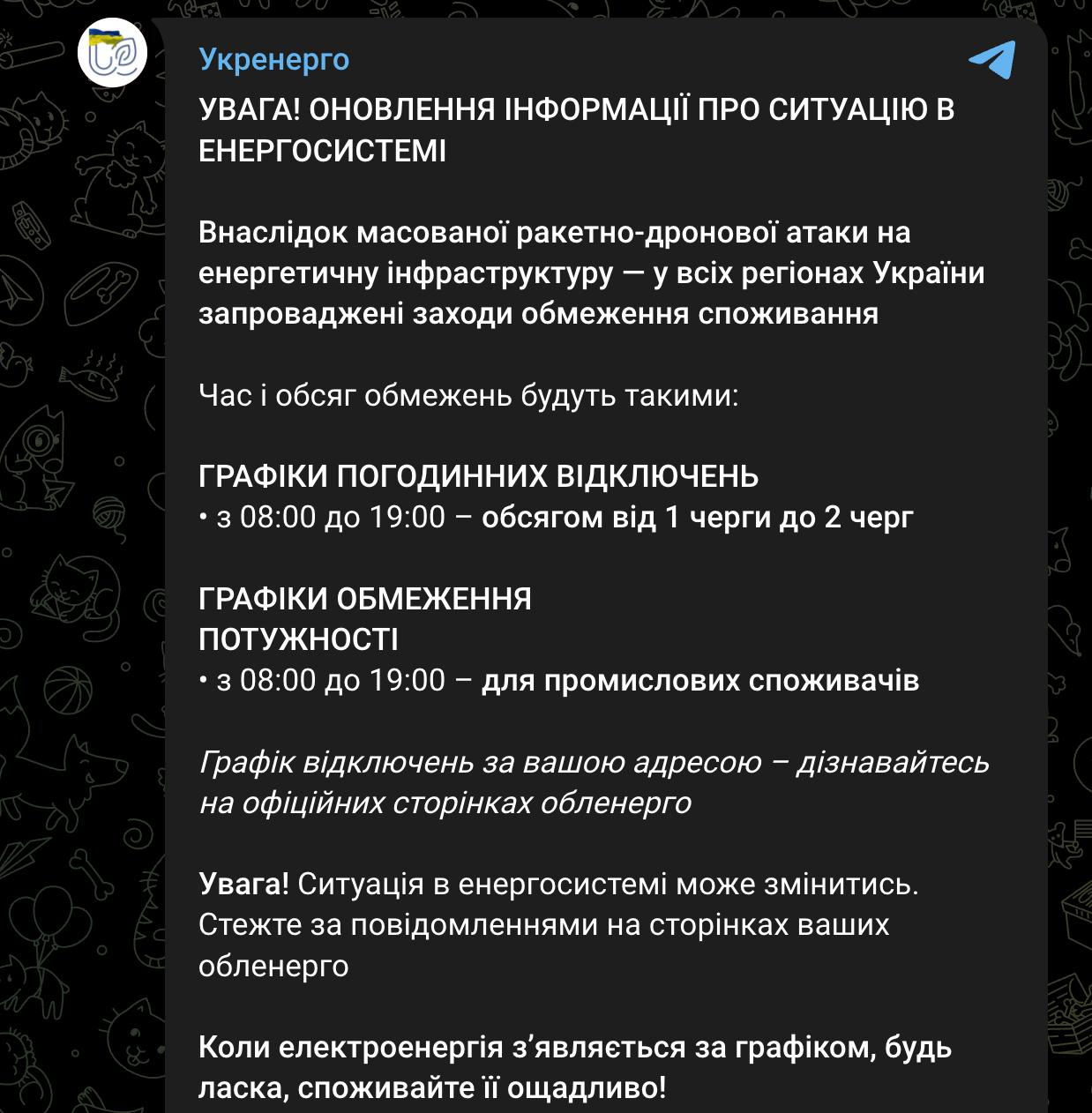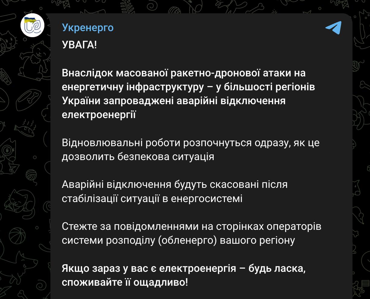 8.37 Уже во всех регионах Украины введены отключения света, сообщает "Укрэнерго".