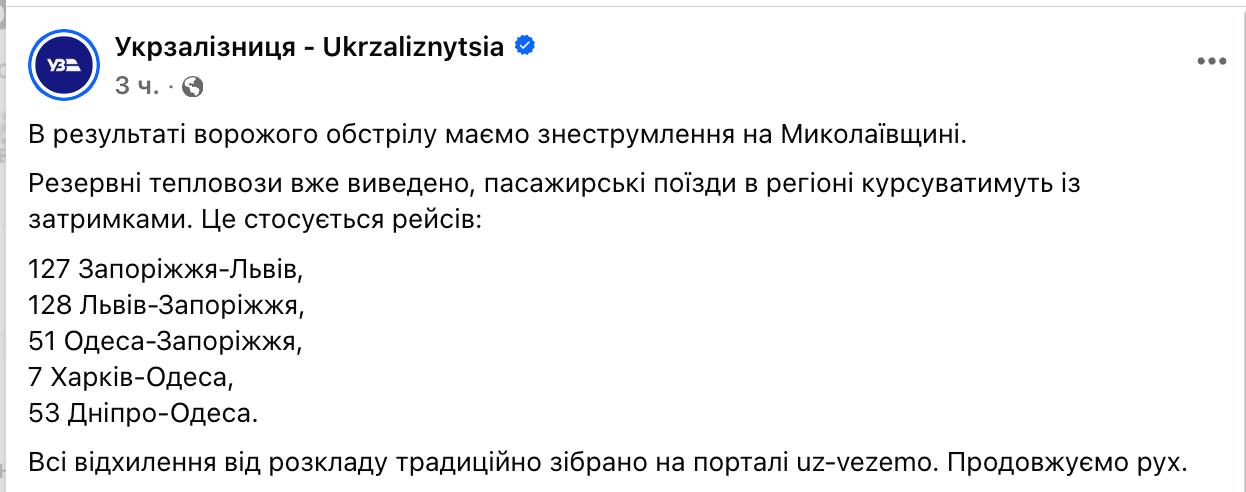 8.40 В Николаевской области после ночного обстрела обесточена железная дорога, и задерживается ряд дальних поездов.