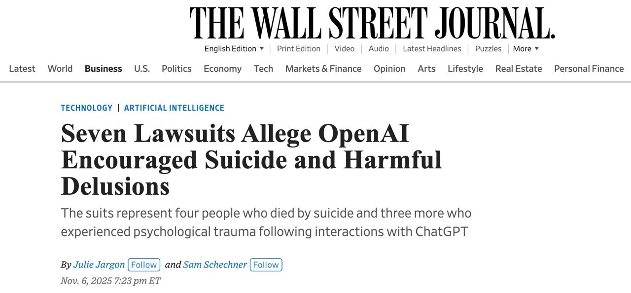 По информации издания, против американской компании разработчика чат-бота OpenAI поданы семь судебных исков представителями четырёх человек, покончивших жизнь самоубийством, и ещё троих, получивших психологическую травму после взаимодействия с ChatGPT.