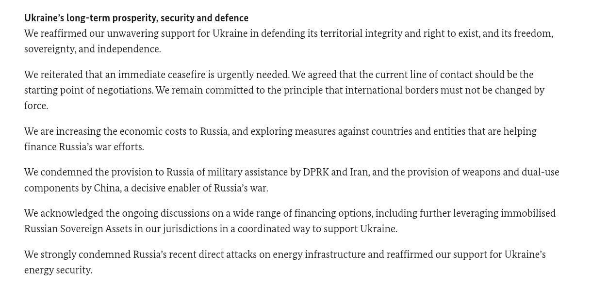 Также страны G7 согласились увеличивать экономические издержки для РФ, в том числе путем принятия мер "в отношении стран и организаций, которые помогают финансировать военные усилия России", и поиска способов использования замороженных российских активов для помощи Украине.