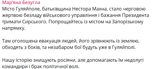 "Попрощайтесь с городом". Безуглая прогнозирует захват Гуляйполя российскими войсками