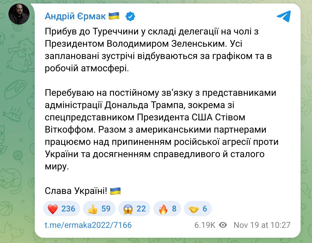 "Вместе с американскими партнерами работаем над прекращением российской агрессии против Украины и достижением справедливого и стабильного мира", - написал Ермак.