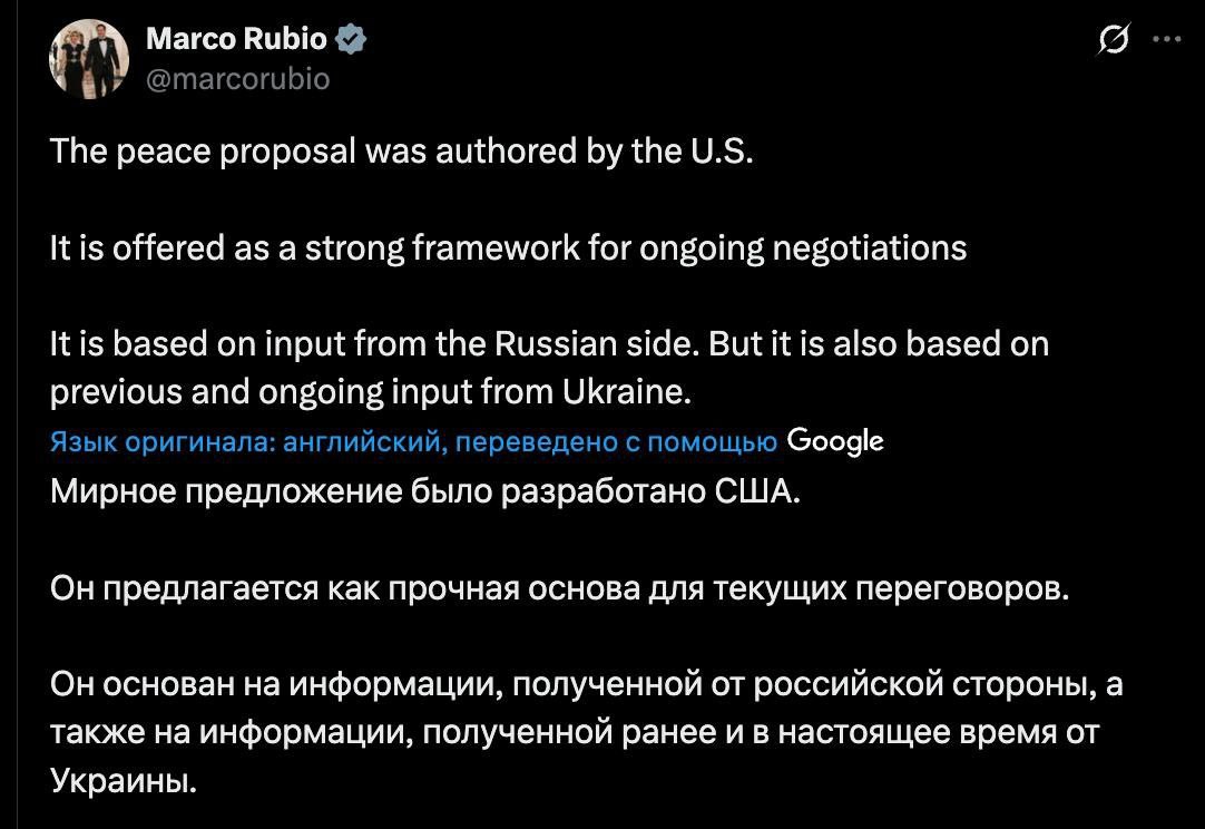 По словам госсекретаря, мирное предложение "было разработано США" и представляет собой "сильную основу" для переговоров: "Оно основано на данных от российской стороны, но также на предыдущем и текущем вкладе Украины".