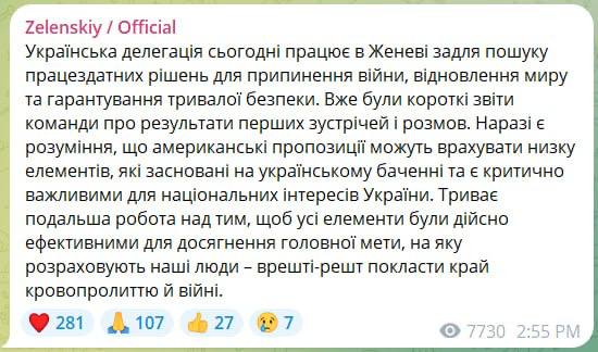 Между тем президент Украины Владимир Зеленский заявил, что "после поступления отчетов" от украинской делегации на переговорах в Женеве "есть понимание, что американские предложения могут учитывать ряд элементов, которые основаны на украинском видении и являются критически важными для национальных интересов Украины".