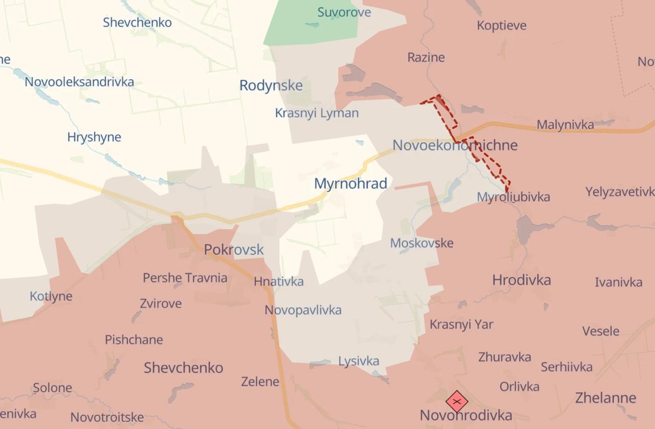 Между тем российские телеграм-каналы вчера написали, что дорога между Покровском и Мирноградом уже физически перерезана и Мирноград полностью окружен, а Покровск целиком захвачен.
