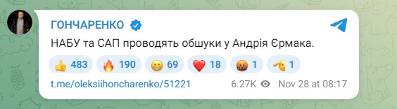 О следственных действиях антикоррупционных органов также написал нардеп из "Европейской солидарности" Алексей Гончаренко. Он назвал три причины обысков: они связаны с приказами силовым структурам следить за сотрудниками НАБУ и САП, участием Ермака в схемах Тимура Миндича, а также с еще одним объектом, который, как утверждает Гончаренко, Ермак "отжимал". По словам нардепа, этот эпизод задокументирован, но СМИ о нем пока не сообщали.