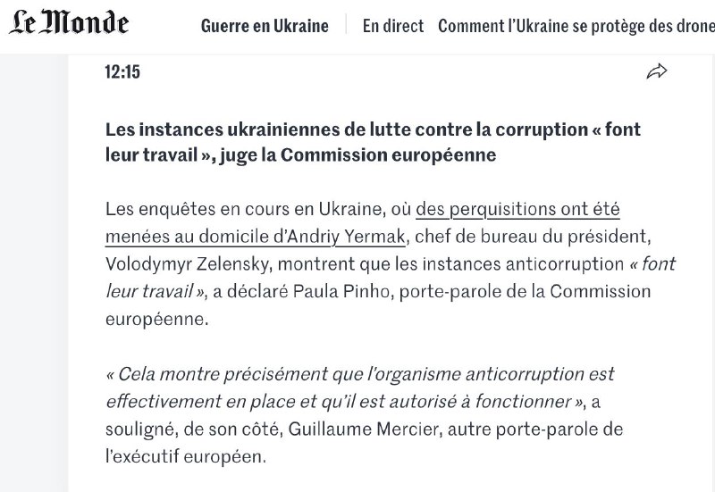 "Мы понимаем, что расследования продолжаются, и имеем большой уровень уважения к этим процессам. Они демонстрируют, что антикоррупционные органы в Украине выполняют свою работу", - приводит слова Пиньо французская газета Le Monde.