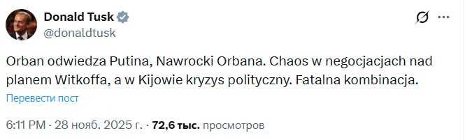 "Орбан посещает Путина, Навроцкий посещает Орбана. Хаос на переговорах по плану Уиткоффа и политический кризис в Киеве. Фатальная комбинация", – пишет Туск.