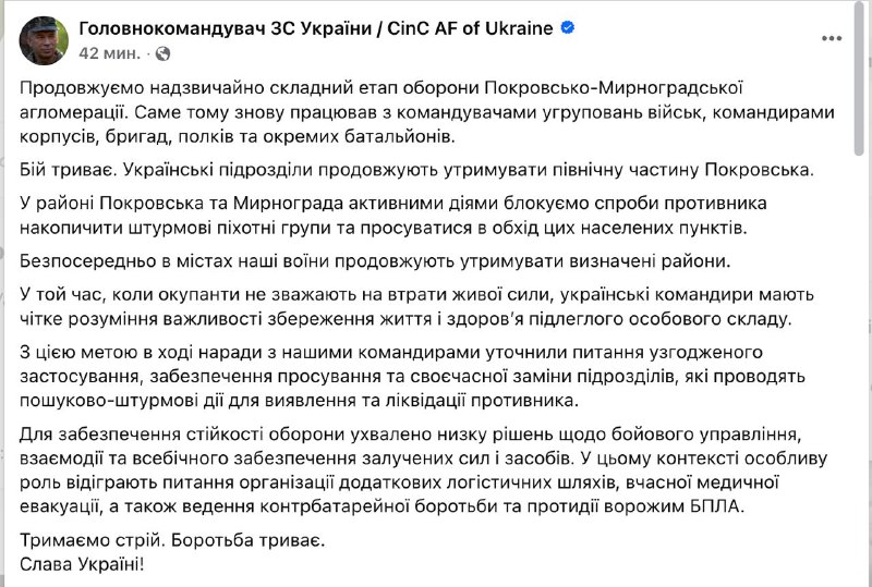 "Бой продолжается. Украинские подразделения продолжают удерживать северную часть Покровска. В районе Покровска и Мирнограда активными действиями блокируем попытки противника накопить штурмовые пехотные группы и продвигаться в обход этих населенных пунктов. Непосредственно в городах наши воины продолжают удерживать определенные районы", - пишет главком.