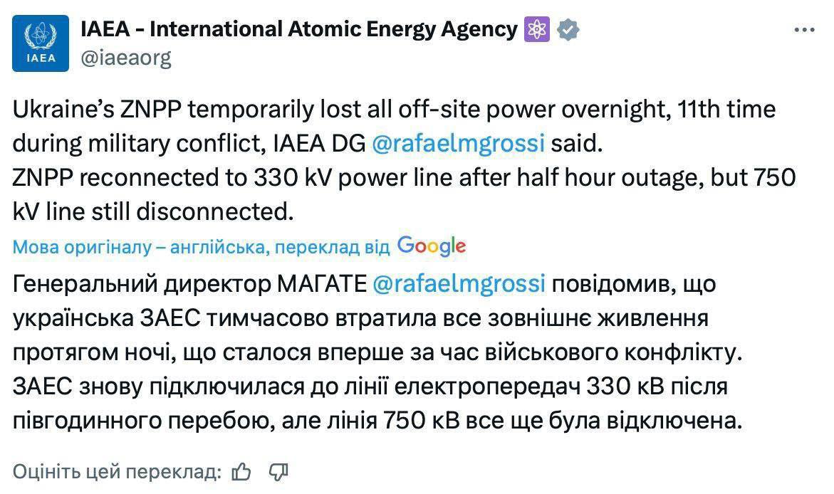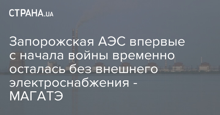 Запорожская АЭС впервые с начала войны временно осталась без внешнего электроснабжения - МАГАТЭ