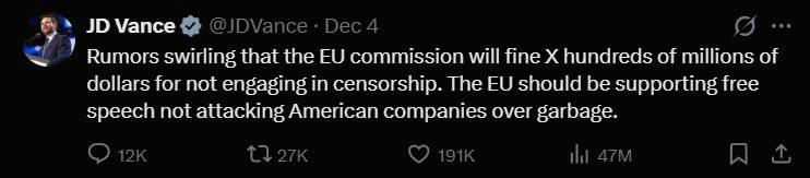 Вице-президент США Джей Ди Вэнс заявил, что "в ЕС должны поддерживать свободу слова, а не штрафовать компании по пустякам".
