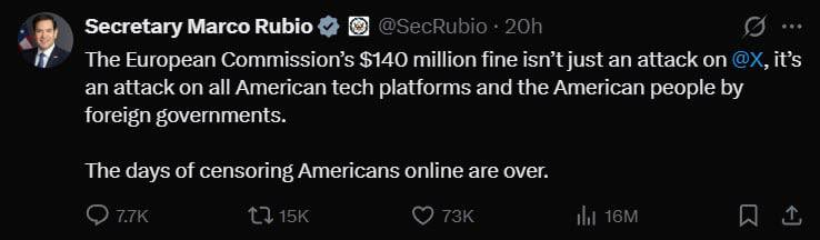 Госсекретарь Марко Рубио назвал этот штраф "атакой на все американские техноплатформы и американский народ".