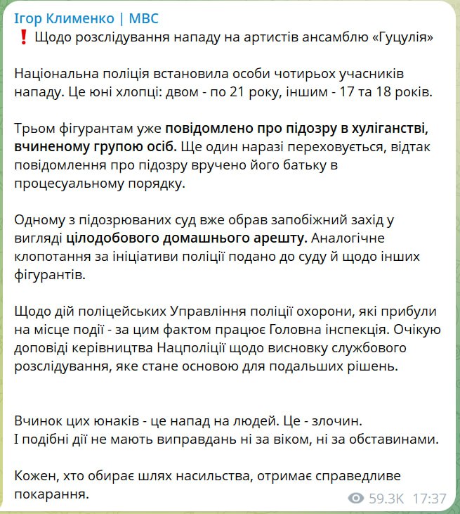 По делу о нападении на ивано-франковский национальный ансамбль песни и пляски "Гуцулия" во Львовской области начались задержания.