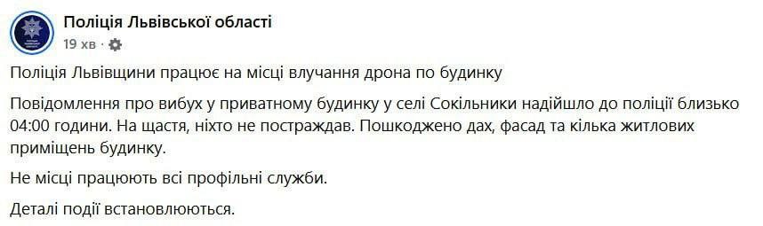 09:00 Беспилотник ударил по дому в пригороде Львова.