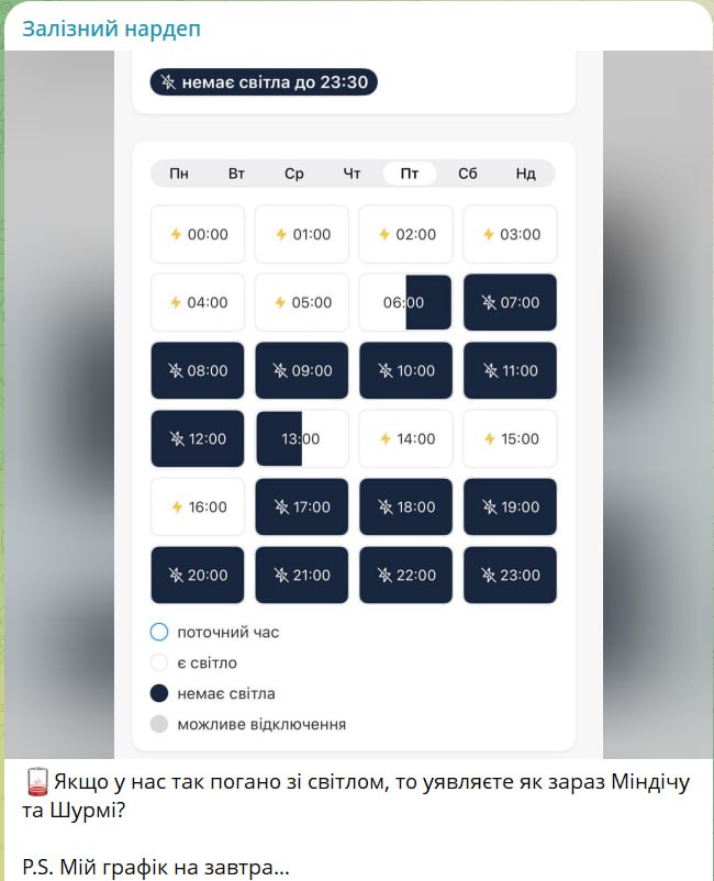 Недовольство графиками отключений выразил и народный депутат из фракции "Голоса" Ярослав Железняк. В своём Telegram-канале он вчера  пожаловался, что по графику у него на 14 часов отключат электричество.
