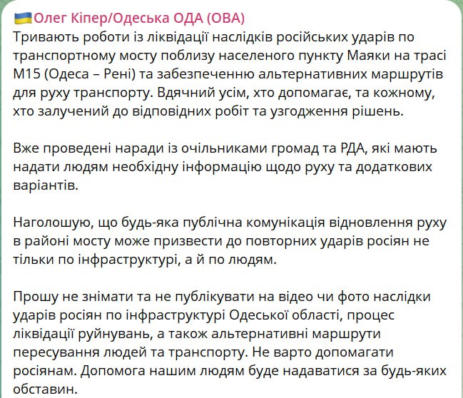 "Отмечу, что любая публичная коммуникация возобновления движения в районе моста может привести к повторным ударам россиян не только по инфраструктуре, но и людям", – написал глава ОВА Кипер.