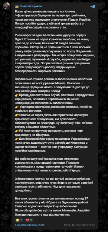 Об этом заявил вице-премьер-министр Украины Алексей Кулеба, комментируя последние удары по Одесской области.
