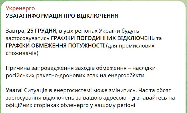 18.44 Графики отключения света завтра будут действовать во всех регионах, сообщает "Укрэнерго".