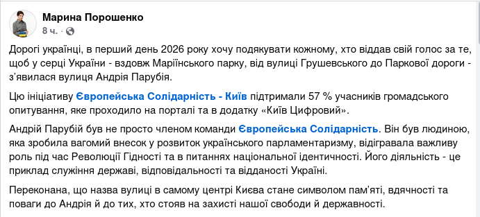 Об этом сообщила лидер фракции "Европейская Солидарность" в Киевском горсовете Марина Порошенко на своей странице в Фейсбуке.