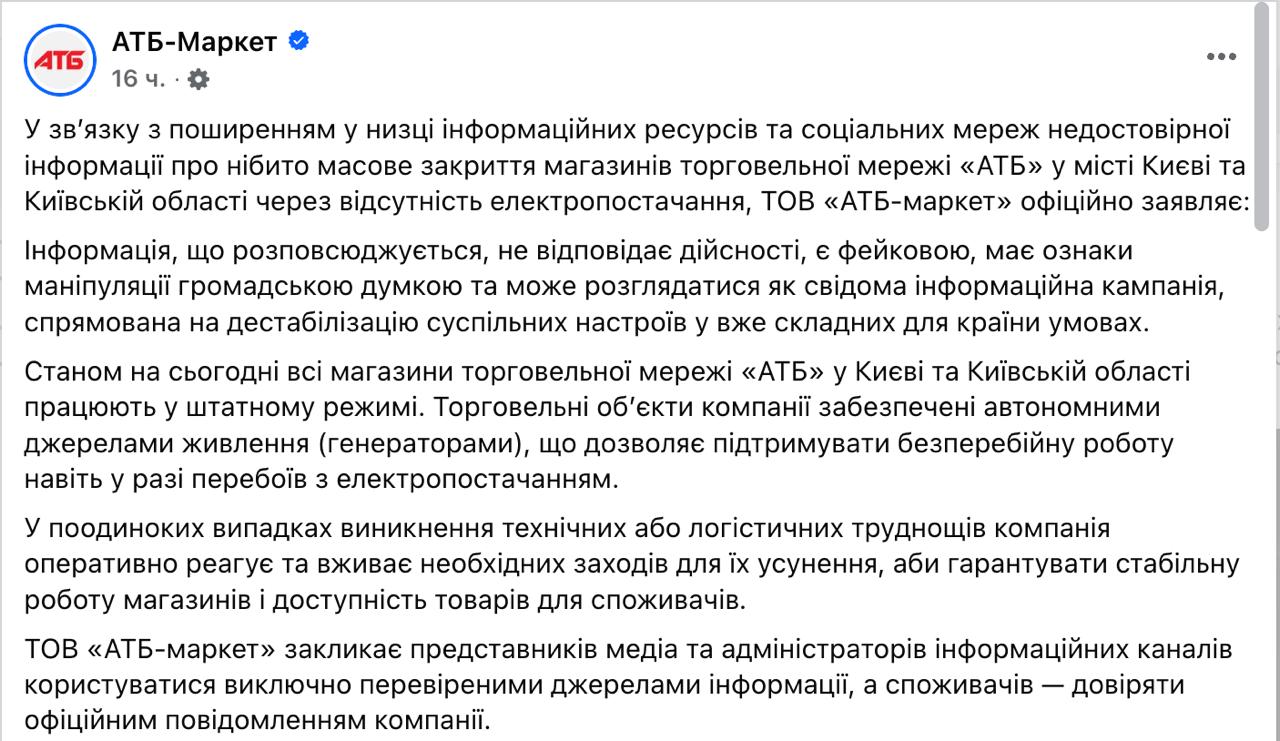 В свою очередь в сети АТБ заверили, что все её магазины в Киеве и области работают в штатном режиме.