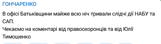 Перед этим народный депутат от партии "Евросолидарность" Алексей Гончаренко сообщил в своем телеграм-канале, что НАБУ и САП почти всю ночь проводили обыски в офисе "Батькивщины".
