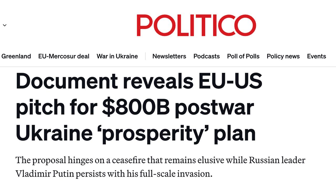 Politico сообщает подробности плана США и Европейского Союза о 800 млрд долл. инвестиций в Украину после войны и ускоренном членстве в ЕС.