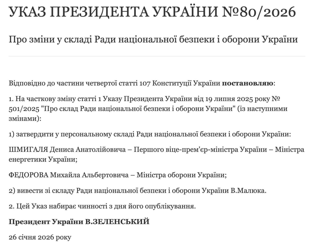 Соответствующий указ №80/2026 о изменениях в составе СНБО был опубликован на сайте главы государства.