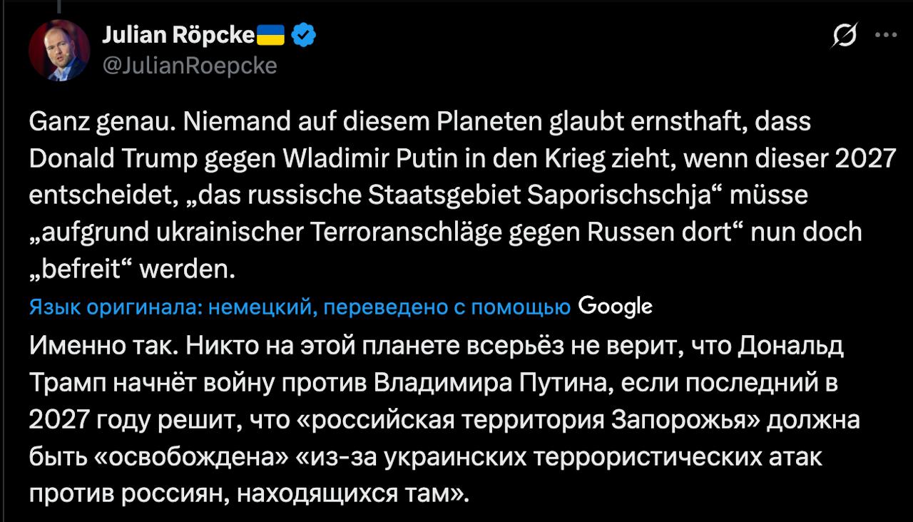 "Никто на этой планете всерьёз не верит, что Дональд Трамп начнёт войну против Владимира Путина, если последний в 2027 году решит, что "российская территория Запорожья" должна быть "освобождена" "из-за украинских террористических атак против россиян, находящихся там", - написал Рёпке в соцсети X.
