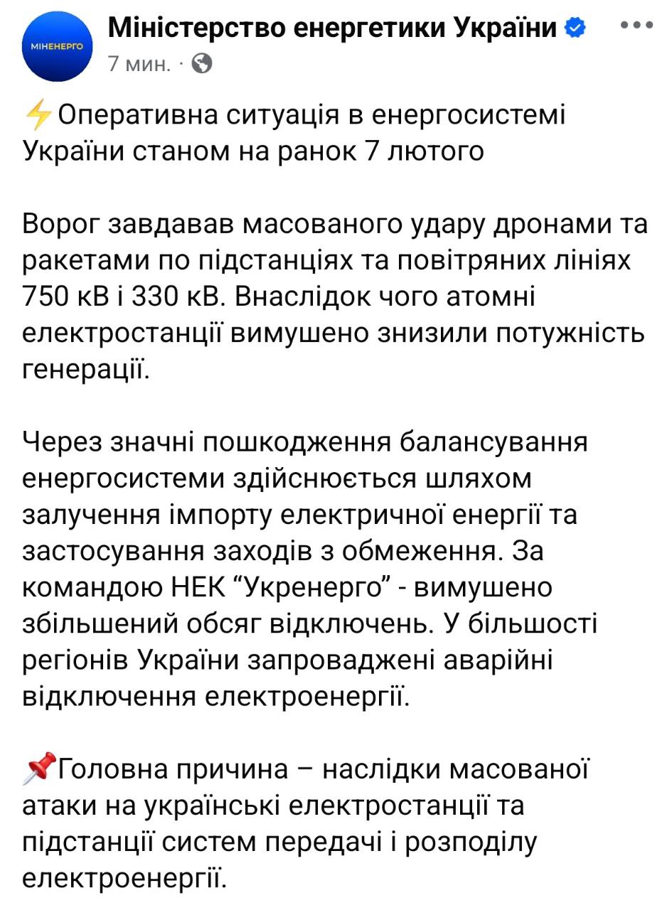 "Враг наносил массированный удар дронами и ракетами по подстанциям и воздушным линиям 750 кВ и 330 кВ. В результате атомные электростанции вынужденно снизили мощность генерации. Из-за значительных повреждений балансировка энергосистемы осуществляется путем привлечения импорта электроэнергии и применения мер по ограничению. По команде НЭК "Укренерго" - вынужденно увеличен объем отключений. В большинстве регионов Украины введены аварийные отключения электроэнергии", - заявили в министерстве.