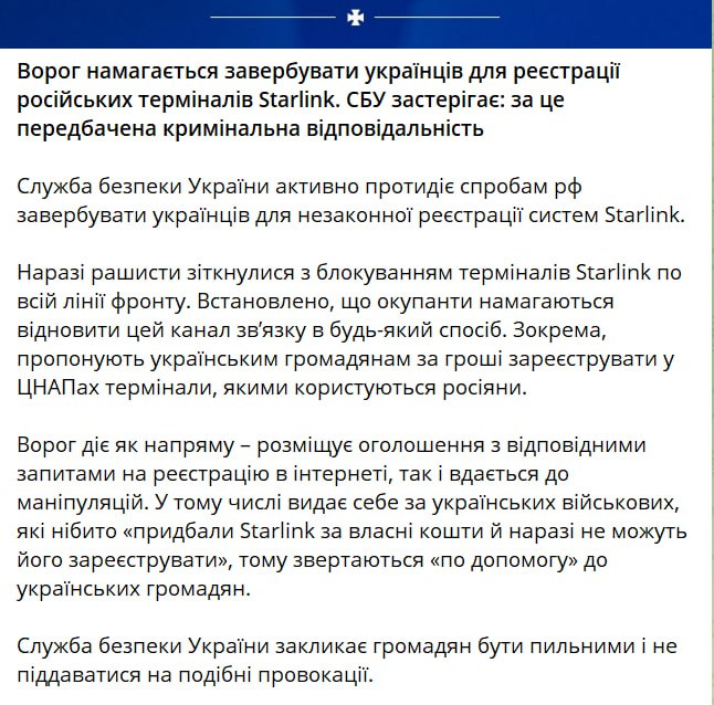 При этом отмечается, что они могут выдавать себя за украинских военных, которые якобы "приобрели Starlink за собственные средства и пока не могут его зарегистрировать".