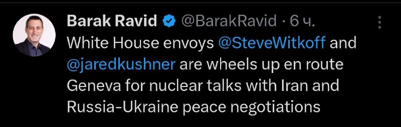 07:50 Представители Трампа Уиткофф и Кушнер вылетели в Женеву для переговоров с делегациями России и Украины. Об этом сообщил журналист Axios Барак Равид.
