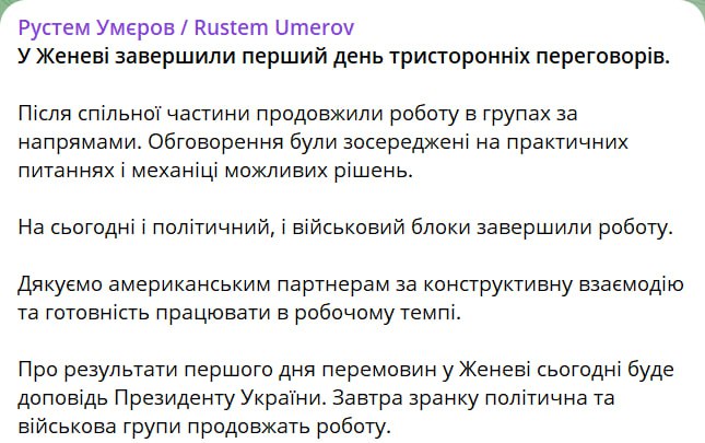 "В Женеве завершился первый день трехсторонних переговоров. После совместной части продолжили работу в группах по направлениям. Обсуждения были сосредоточены на практических вопросах и механике возможных решений. На сегодняшний день и политический, и военный блоки завершили работу. Благодарим американских партнеров за конструктивное взаимодействие и готовность работать в рабочем темпе", - пишет секретарь СНБО.
