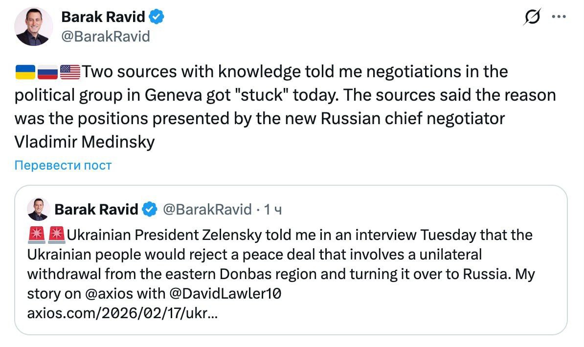 Как пишет Равид, переговорщикам не удалось согласовать "политическую часть" шагов по урегулированию российско-украиснкой войны. По словам источника, причиной этого стали позиции, озвученные новым главой российской переговорной группы Владимиром Мединским.