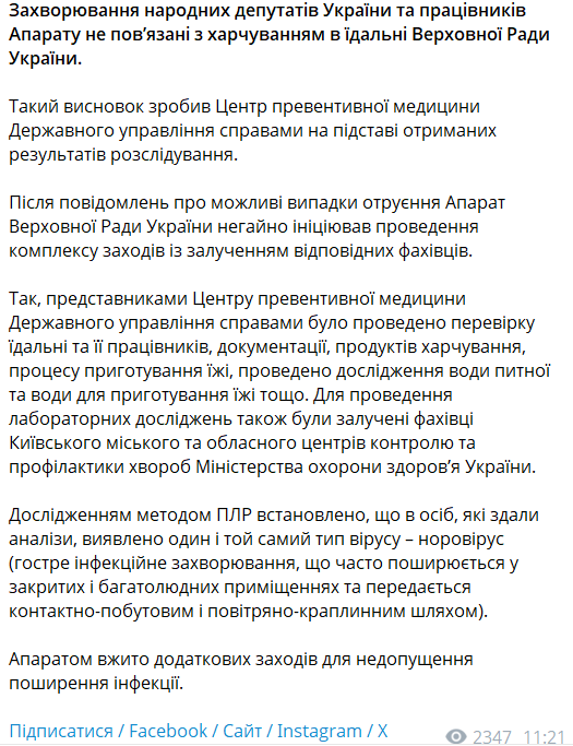 Отравление народных депутатов и сотрудников аппарата парламента связано со вспышкой норовируса, а питание в столовой к их недомоганию ни при чём.