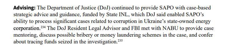 "Министерство юстиции США (DoJ) продолжало предоставлять САП стратегические консультации и советы по конкретным делам, финансируемые INL, что, по словам DoJ, позволяло САП эффективно обрабатывать важные дела, связанные с коррупцией в государственной энергетической компании Украины (очевидно, речь идет об "Энергоатоме" - Ред.) Юридический советник DoJ и ФБР встречались с НАБУ для наставничества по делам, обсуждения возможных схем взяточничества или отмывания денег и координации по поводу отслеживания средств, изъятых в расследовании", - говорится в докладе.
