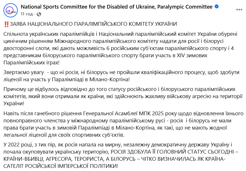 "Сообщество украинских паралимпийцев и Национальный паралимпийский комитет Украины возмущены циничным решением Международного паралимпийского комитета предоставить для России и Беларуси двусторонние слоты, которые дают возможность 6 российским субъектам паралимпийского спорта и 4 представителям белорусского паралимпийского спорта участвовать в XIV зимних Паралимпийских играх", - говорится в заявлении.