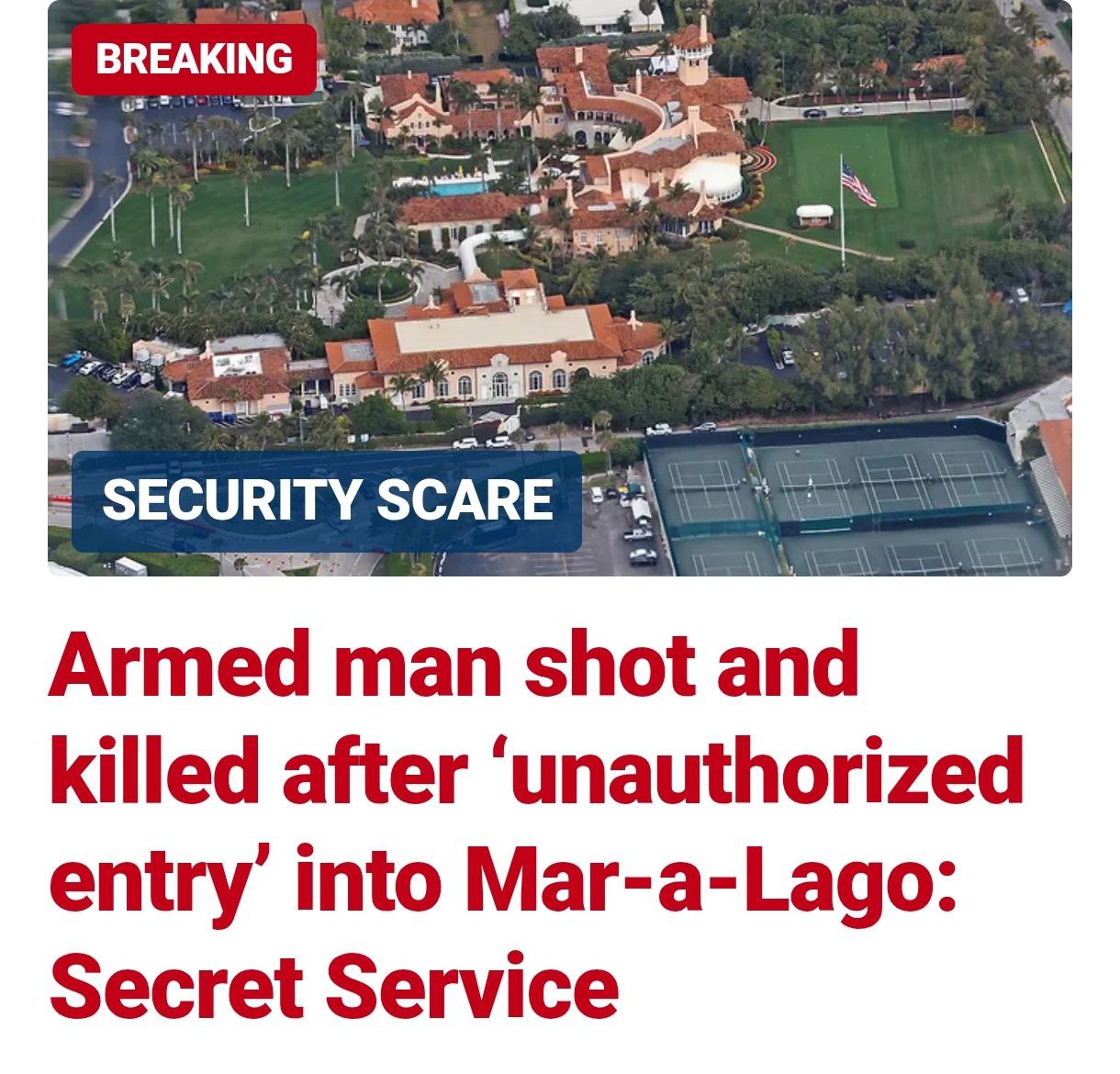 Охрана президента США Дональда Трампа застрелила вооружённого мужчину, который пытался проникнуть в резиденцию Мар-а-Лаго во Флориде, где находится имение американского лидера.