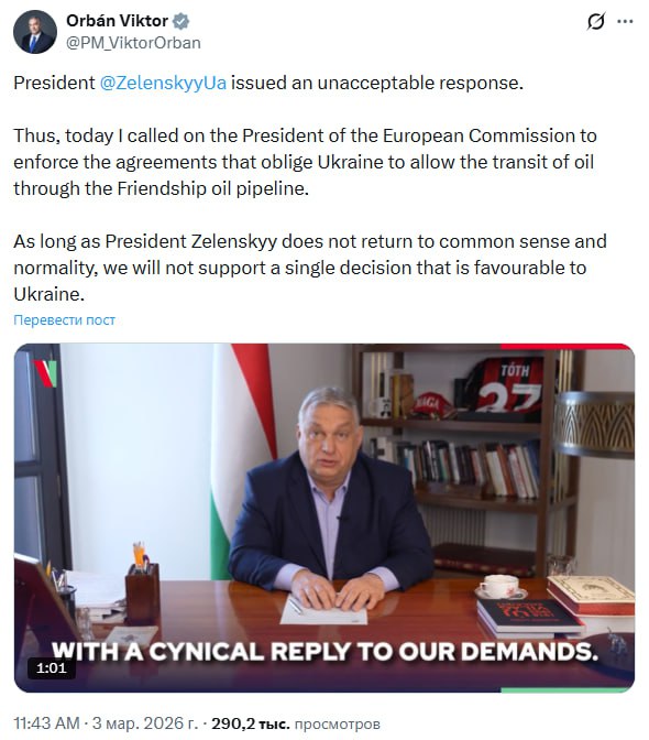 "Президент Зеленский дал неприемлемый ответ. Таким образом, сегодня я призвал председателя Европейской комиссии обеспечить выполнение соглашений, обязывающих Украину разрешить транзит нефти по нефтепроводу "Дружба". Пока президент Зеленский не вернется к здравому смыслу и нормальной жизни, мы не поддержим ни одного решения, благоприятного для Украины", – заявил премьер Венгрии.