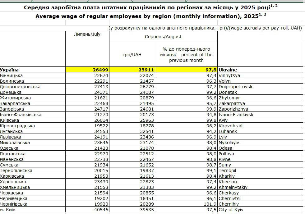 У серпні 2025 року середня зарплата по Україні скоротилася порівняно з липнем на 2,2%: з 26499 грн до 25911 грн. У Києві вона знизилася на 2,5%: з 40546 грн до 39535 грн.