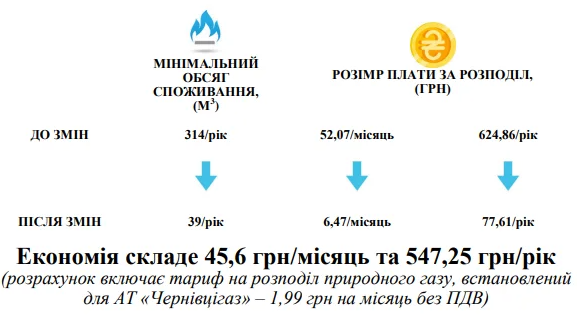 Як приклад, Нацкомісія навела зміну платежу за розподіл природного газу для побутового споживача з комплексним споживанням у Чернівецькій області з опломбованим обладнанням (опалювальний прилад та водонагрівач) та мінімальними обсягами споживання у попередньому газовому році.