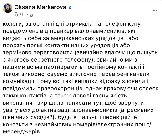 "Колеги, за останні дні отримала на телефон купу повідомлень від пранкерів/зловмисників, які видають себе за американських чиновників і або просять прямі контакти наших чиновників, або терміново переговорити (звісно, вдаючи, що пишуть з якогось секретного телефону)", – написала посол.
