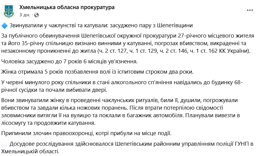 За даними правоохоронців, 27-річний місцевий мешканець та його 35-річна спільниця катували сусідку та погрожували їй вбивством. Зазначається, що у червні минулого року спільники у стані алкогольного сп'яніння навідалися до будинку 68-річної сусідки та почали вибивати двері.